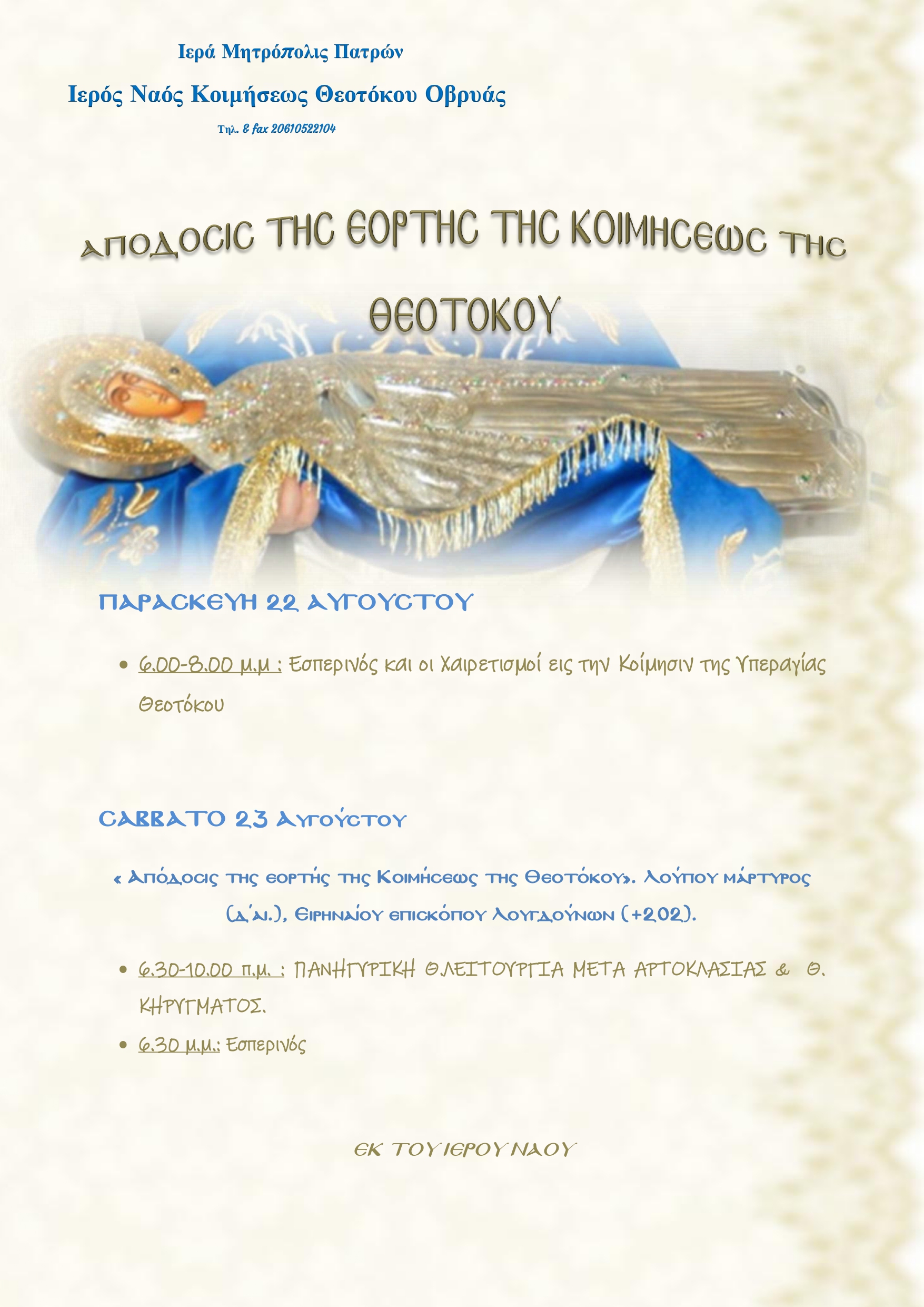 Τα νεα μας 15 Αυγούστου 202531 Ιουλίου 2025 ΑΠΟΔΟΣΙΣ ΚΟΙΜΗΣΕΩΣ ΘΕΟΤΟΚΟΥ Posted By: Ι.Ν. Κοιμήσεως Θεοτόκου Οβρυάς 0 Comment