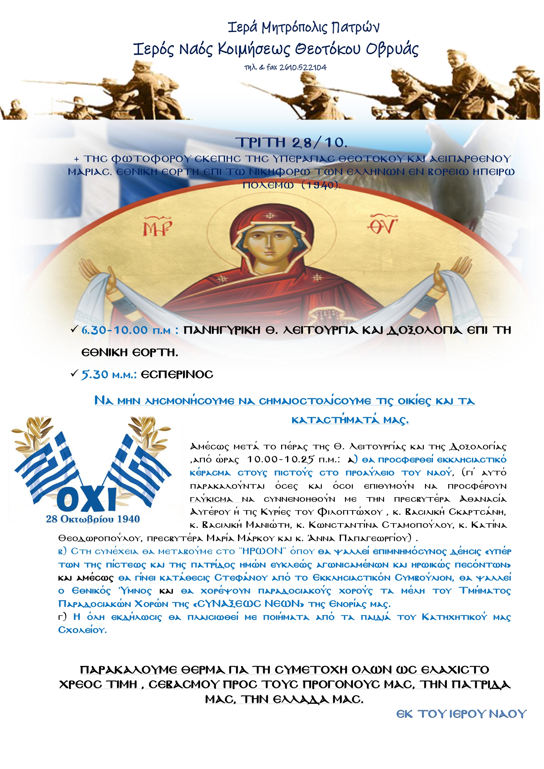 Τα νεα μας 24 Οκτωβρίου 202525 Οκτωβρίου 2025 28η Οκτωβρίου 2025 Posted By: Ι.Ν. Κοιμήσεως Θεοτόκου Οβρυάς 0 Comment